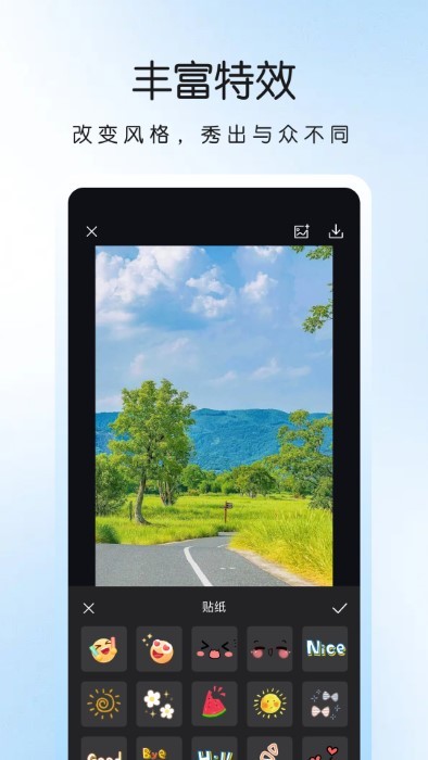 超百种的不同风格滤镜,针对风景、人物、建筑、人像滤镜、美食滤镜、复古滤镜、胶片滤镜给你不一样的风格体验。只要动动手指,让照片随意切换滤镜风格,总有一款滤镜能展现你的style。