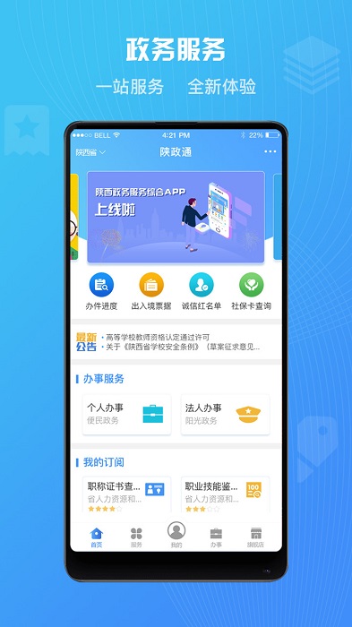 陕政通app一款有着众多便民服务的app,实现手机上就能进行业务办理,非常的方便,免去了线下排队办理的麻烦,最新的政务新闻为用户进行推送,及时的进行告知,需要的用户可以来进行下载。