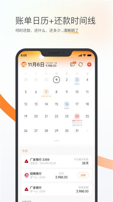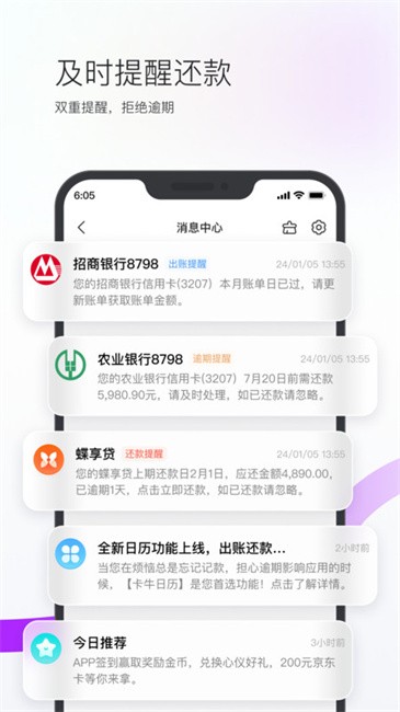 2.贴心的账单日历功能:账单日、还款日、还款金额、免息期等账单信息的日程管理,智能提醒避免逾期;