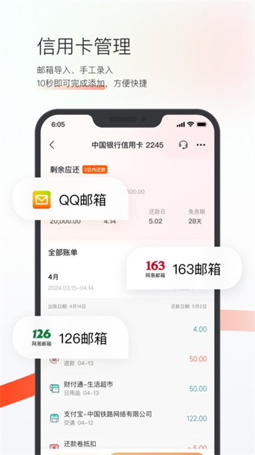 3.多机构账单管理:支持招商银行、工商银行、中国银行等127家银行账单的一键导入,支持100+贷款机构账单添加,轻松管理多张卡片;
