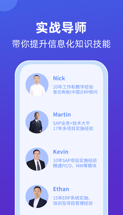 莱学习在信息化、数字化人才教育领域,积累了丰富的经验。50多位行业顾问讲师及专业教职员工,多来自外资与大型企业的项目实施,平均具备8-12年的专业项目经验,涉猎领域广泛,涵盖机械制造、金融、电力、汽车、化工、零售、外贸,船舶、航空、重工业等,为莱学习的教学水平、课程研发、技术实力等保驾护航。