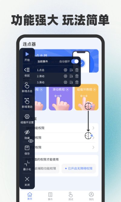 手势录制,功能多样;体积小不占用手机内存,有效的制作各种有效游戏和应用辅助脚本,