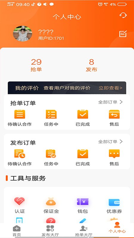 1.在用户的个人中心中,可以让2265用户查看到自己的所有的抢单订单的记录,包括但不限于待确认合作、任务中、以及已经完成的项目内容信息。
