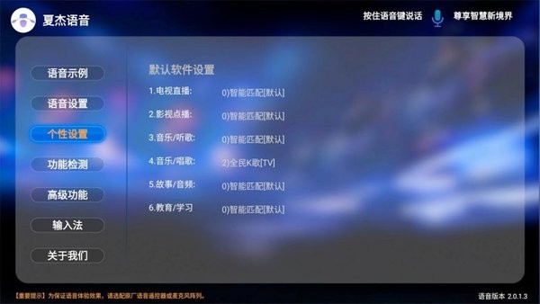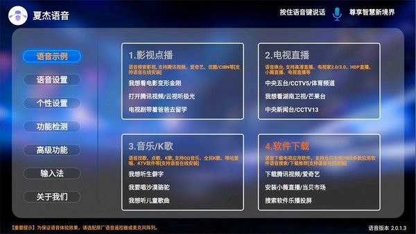 夏杰语音电视版是一款用于安卓系统的智能电视使用的软件,通过本app用户朋友即可轻松的进行电视语音交互操作,让你可以使用语音输入的方式来进行交互,无论是k个还是语音换他或者是通过语音来进行你需要的操作都极为方便!
