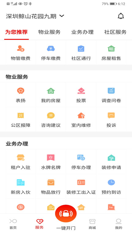 它为客户提供的移动服务app,提供在线的投诉报修、开门、在线缴费、停车交费等基础服务,同时提供社区商城、上门到家、理财等增值服务。