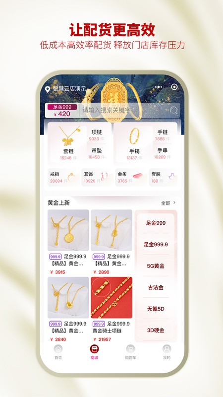 智慧金店管理app通过线上就可以对所有的黄金销售产品进行配货与采购,能够得到想要预购的所有黄金首饰商品,将各类型的黄金产品提供上架,方便店家在日常的配货中对足金项链以及吊坠和手镯等产品挑选和配货采购,实现现货随时配置与采购,减少门店的产品库存存放的压力。属于黄金销售门店管理应用软件,为所有的金店提供的一个线上管理的系统平台,可以在应用上获取到供应链以及智能商城服务!