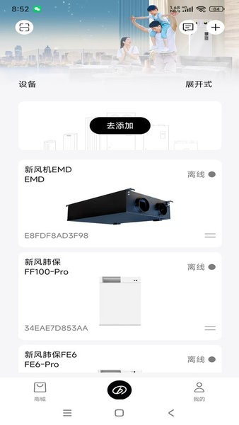 设备模块可通过添加设备,选择对应的机型来配网绑定环境仪、洁净新风机和新风肺保设备。绑定成功后,进入设备列表页面可以选择具体设备来实时操作(包括开关机、模式切换、调频、PM2.5检测、实时风量、实时温度等多种功能),达到远程控制设备的体验。
