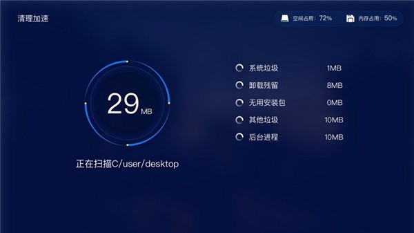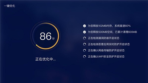 具备清理垃圾、系统加速、网络测速、网络诊断、电视控屏等管理功能