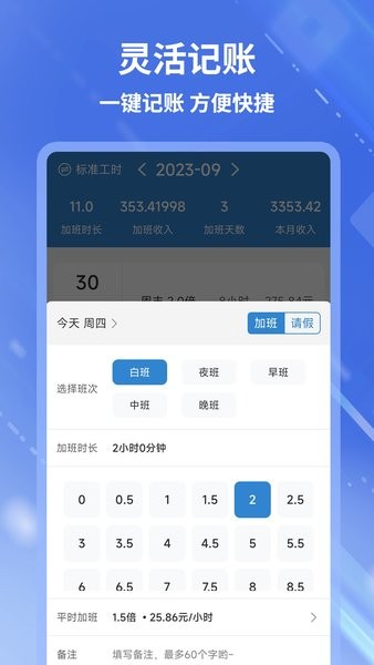 开心记加班最新版是一款专业的加班记录软件,在这里有超多精彩的功能等你来体验,一键式操作更精彩,你的工作小助手,还有超多精彩的功能等你来体验,一键式记录你的加班情况,更多精彩等你来!