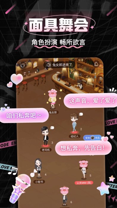 角色扮演面具舞会,指挥、执行、即兴表演。语音速配匿名连麦,不看颜值走心交友,用声音撩开面具下的秘密。