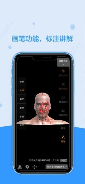 中医穴位实训平台app含有三维人体穴位展示,能够看全身也可以看局部的穴位和经络,在看的时候还能进行标注,同时可以根据穴位的名称精准搜索对应的身体位置,学习以后还能进行找穴测试,检验自己的学习效果!