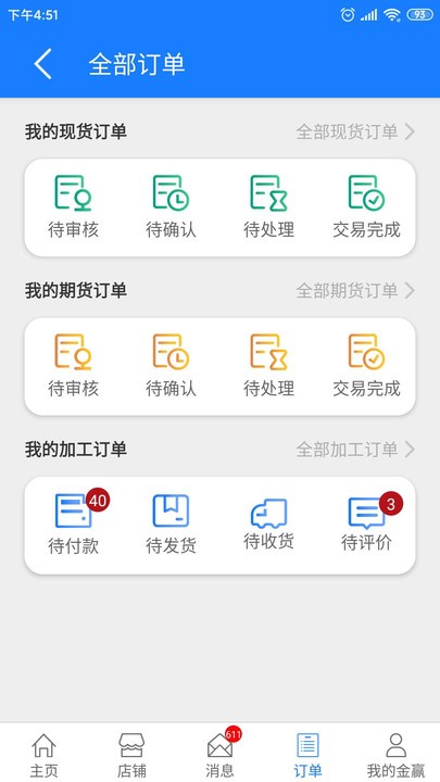 分类浏览统计的订单信息,包括现货订单、期货订单、加工订单等操作。