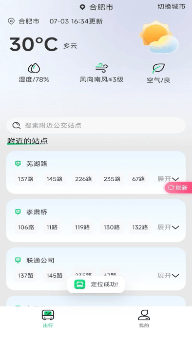 定位你的城市,可以在这里展示你的附近的公交站点信息,还有天气查看。
