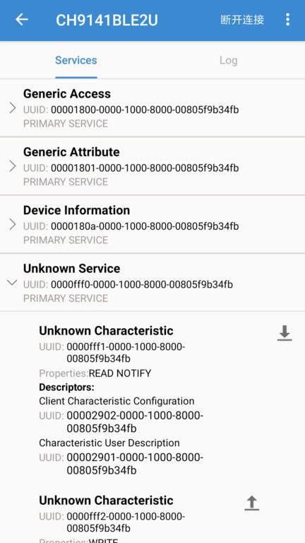 9.实时扫描蓝牙设备并显示信号强度,连接后自动枚举服务与特征值,支持特征值读写,支持notification开启和关闭