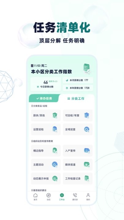 通过工作台,您可以完成指定工作,并获得相应的垃圾分类工作指数,垃圾分类工作指数将是衡量小区分类工作开展情况的重要指标,获取更高的指数将有机会登顶小区排行榜,从而让更多人看到小区的工作!
