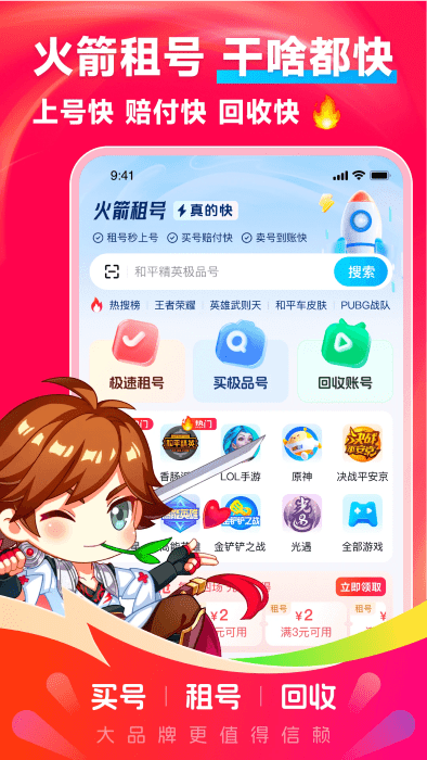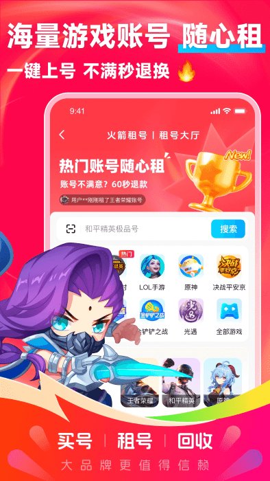 火箭租号app帮助更多的用户们在这里找到自己喜欢的游戏账号,超低的价格,可以随意的租借,让你在游戏中也能体验大神福利,热门游戏什么都有,都是一些极品的账号,同时还提供了找回包赔,让你安全购买账号,一起来看看吧!