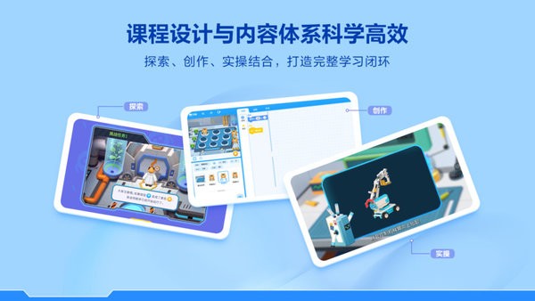 探索课、创作课和实操课三种课程形式科学排布,打造完整高效的学习闭环。探索课中以动画闯关解锁编程知识,有趣的互动操作激发孩子持续学习的动力;创作课中综合项目进阶挑战,应用创作融会贯通;实操课中软硬件结合编程训练,用编程知识解决实际问题,学以致用。