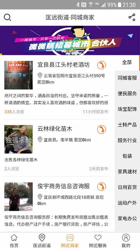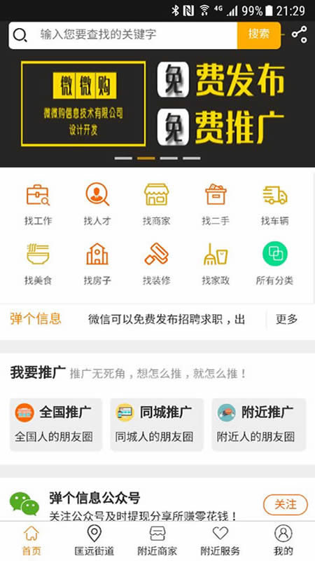 弹个信息是一个展示附近信息和商家的平台,自动为用户定位当前地理位置,提供各种信息推广服务,找人才、找商家、找二手、找工作、找家政等,全国信息通过地址切换都可查看,真正的身边服务平台.