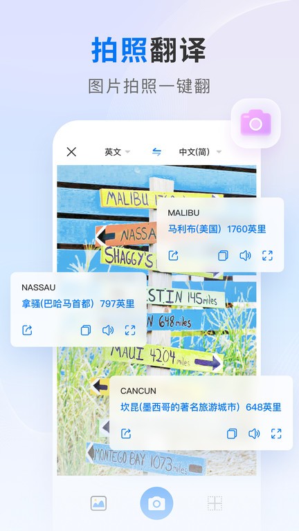 - 支持文字输入的翻译,还可以通过拍照或图片输入进行翻译;