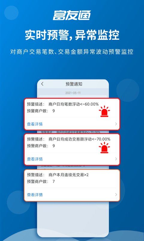 富友通是一个为业务员拓展商户使用的现场录单工具.接收重要的预警信息,快速的处理待办事务,及时的查看商户交易情况,帮助业务员提升业绩.