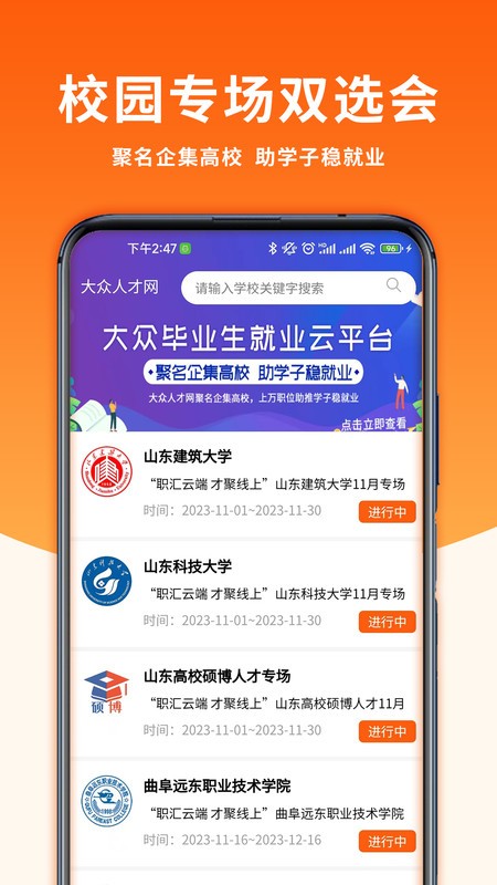 大众人才网官方版是一款给毕业季大学生们打造的线上和线下2种方式展开的校园招聘会,海量的公司单位和各种种类岗位,方便大家高效快捷找到适合心仪的好工作。