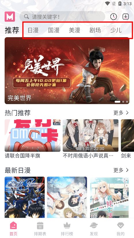 1、打开app,能看到推荐、日漫、国漫、美漫、剧场、少儿几个栏目;