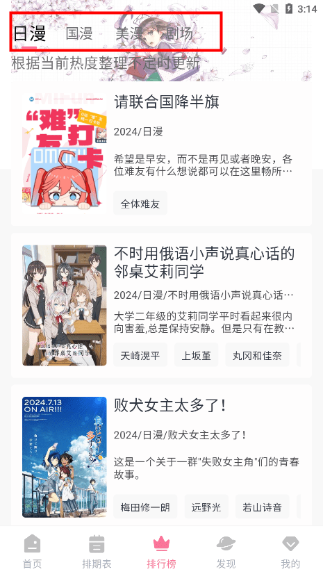 3、在排行榜栏目,可以看到最热门的日漫、国漫、美漫和剧场;