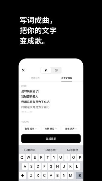 其中灵感创作功能支持自定义输入编辑,软件也提供了灵感案例;自定义创作支持最多输入 200 个字的歌词,也支持一键生词,可以一键生成歌词,包括:主歌歌词、副歌歌词。