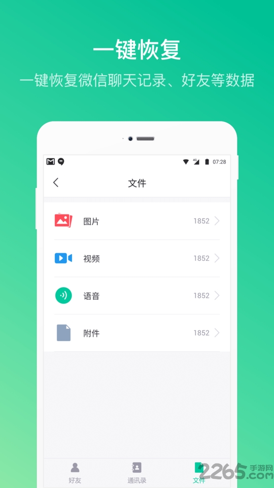 打开APP,呈现出图片,音乐,视频和文档四类文件分类 -【文件恢复】恢复误删文件,包括音频、视频、图片、Word文档、Excel文档,PPT文件、文本文件、压缩文件、PDF -【存储器占比】数字百分比,使得手机所占存储器一目了然 数据恢复帮助您轻松恢复并查看已经恢复的文件,为您的生活提供便利!