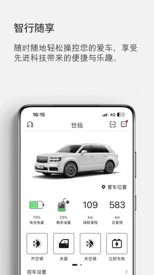 世籍荟app下载安装致力于开启智能驾车的全新享受,专为世极汽车车主打造;在这里,你可以远程车辆设定,可以享受多项贴心服务,随时查看车辆的状况、最新的路况信息等,通过连接数据中心,用户可通过自然语言与车辆交互,从而解放双手,提高驾驶的安全性,有需要的小伙伴们就快来下载使用吧!