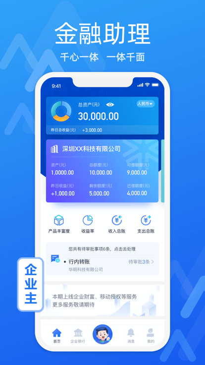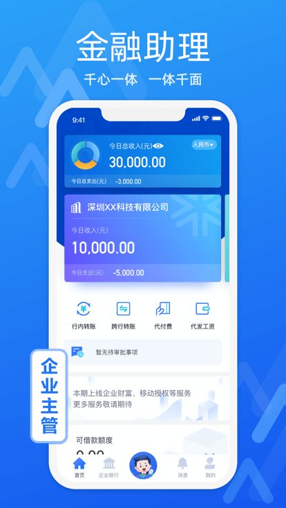客户可通过APP可享受查询企业资产、资产收益分析、移动审批等金融服务,随时随地监测账户信息,满足客户移动金融办公的需求。