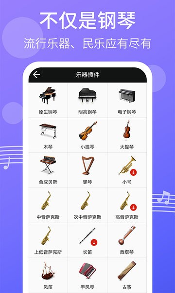 7.完美支持多种乐器音色: 钢琴、吉他、大提琴、小提琴、八音盒、管风琴、古筝、琵琶、二胡、风笛、贝斯合成器、萨克斯、弦乐合奏、电子琴等。不仅支持流行乐乐器,也支持民乐乐器。