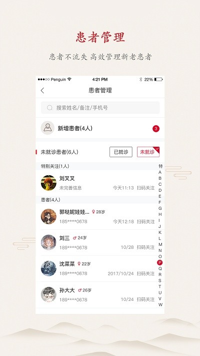 【患者列表】标签化管理精准分类随时了解患者病愈情况。