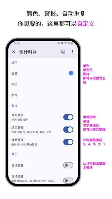 6. 添加了计时器自动重置功能。开启后,在计时器完成且警报完成一段时间之后,会自动重置,具体重置的时间可以自定义。